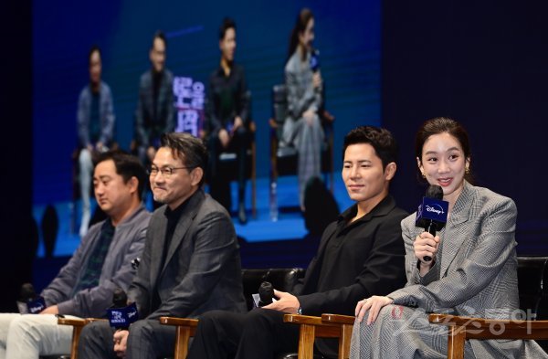 배우 정려원이 21일 서울 중구 소공동 웨스틴조선 서울에서 열린 디즈니플러스 시리즈 ‘변론을 시작하겠습니다’ 제작발표회에서 진행자의 질문에 답하고 있다.