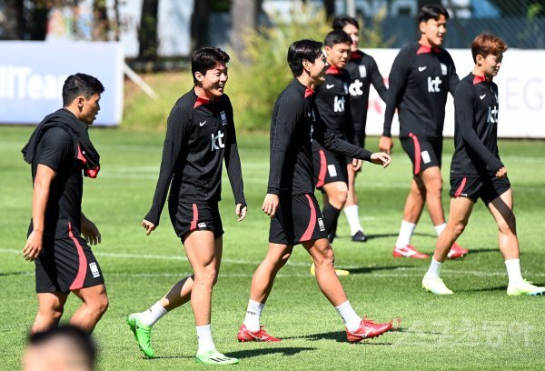 코스타리카, 카메룬과 평가전을 앞둔 한국축구국가대표팀이 21일 경기도 파주 축구대표팀트레이닝센터(NFC)에서 훈련을 가졌다. 축구대표팀 황의조가 훈련도중 휴식시간에 웃고 있다.