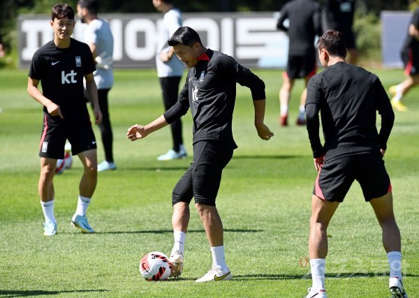 코스타리카, 카메룬과 평가전을 앞둔 한국축구국가대표팀이 21일 경기도 파주 축구대표팀트레이닝센터(NFC)에서 훈련을 가졌다. 축구대표팀 김민재가 패싱훈련을 펼치고 있다.
