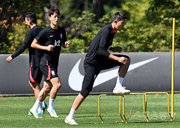 코스타리카, 카메룬과 평가전을 앞둔 한국축구국가대표팀이 21일 경기도 파주 축구대표팀트레이닝센터(NFC)에서 훈련을 가졌다. 축구대표팀 김민재가 기구를 이용해 몸을 풀고 있다.