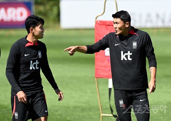 코스타리카, 카메룬과 평가전을 앞둔 한국축구국가대표팀이 21일 경기도 파주 축구대표팀트레이닝센터(NFC)에서 훈련을 가졌다. 축구대표팀 손흥민과 김민재가 이야기를 나누고 있다.