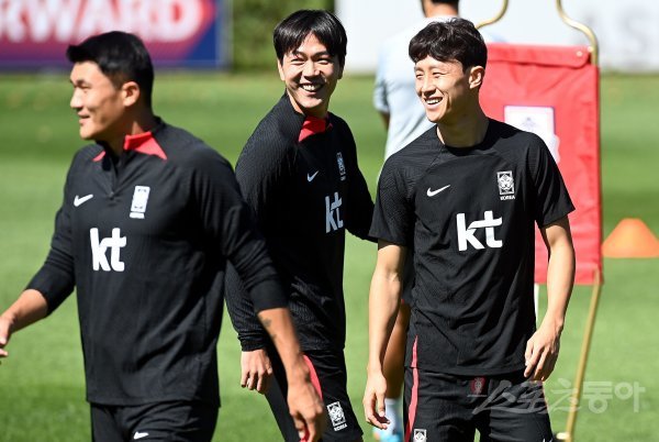 코스타리카, 카메룬과 평가전을 앞둔 한국축구국가대표팀이 21일 경기도 파주 축구대표팀트레이닝센터(NFC)에서 훈련을 가졌다. 축구대표팀 김영권, 이재성이 훈련도중 미소를 짓고 있다.