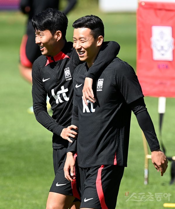 코스타리카, 카메룬과 평가전을 앞둔 한국축구국가대표팀이 21일 경기도 파주 축구대표팀트레이닝센터(NFC)에서 훈련을 가졌다. 축구대표팀 손흥민이 김태환에게 장난을 치고 있다.