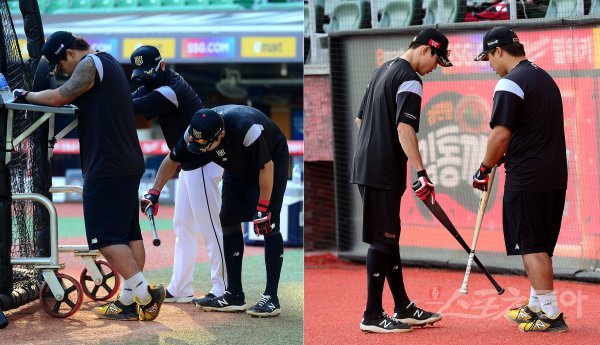 21일 인천 SSG 랜더스필드에서 ‘2022 신한은행 SOL KBO리그’ SSG 랜더스와 kt 위즈의 경기가 열린다. 경기 전 kt 강백호와 배정대가 훈련도중 장난을 치고 있다.
