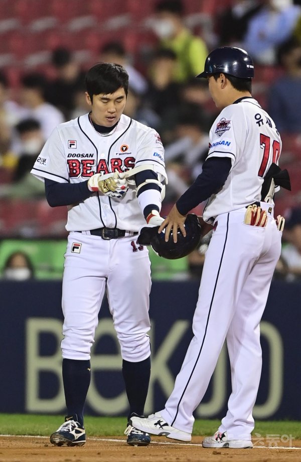 21일 서울 잠실야구장에서 열린 ‘2022 신한은행 SOL KBO리그’ 두산 베어스와 NC 다이노스의 경기에서 1회말 1사 1루 병살타를 친 두산 허경민이 아쉬워하고 있다.