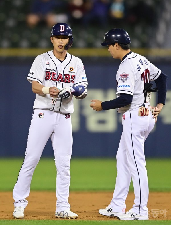 21일 서울 잠실야구장에서 열린 ‘2022 신한은행 SOL KBO리그’ 두산 베어스와 NC 다이노스의 경기에서 4회말 무사 2루타를 친 두산 전민재가 1루코치에게 보호 장비를 주고 있다.