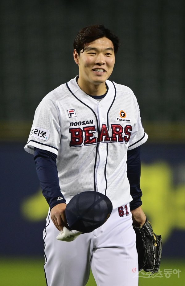 21일 서울 잠실야구장에서 열린 ‘2022 신한은행 SOL KBO리그’ 두산 베어스와 NC 다이노스의 경기에서 1회초 무실점으로 수비한 두산 최원준이 기뻐하고 있다.