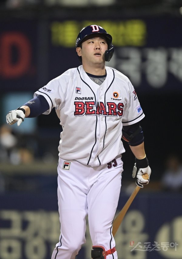 21일 서울 잠실야구장에서 열린 ‘2022 신한은행 SOL KBO리그’ 두산 베어스와 NC 다이노스의 경기에서 4회말 1사 3루 두산 양석환이 헛스윙 삼진 아웃을 당하고 있다.