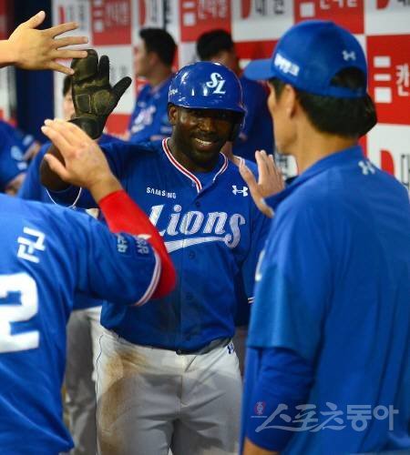 21일 서울 고척스카이돔에서 ‘2022 신한은행 MY CAR KBO리그’ 삼성 라이온즈와 키움 히어로즈 경기가 열렸다. 5회초 1사 1루 삼성 우전 안타 때 1루주자 피렐라가 키움 실책으로 득점에 성공한 후 하이파이브 하고 있다.