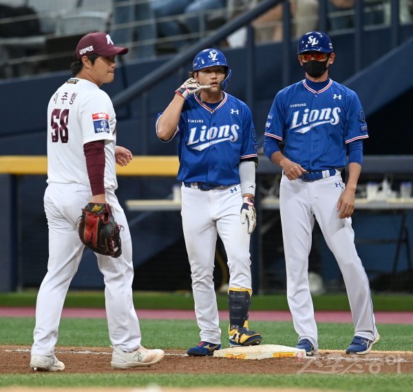 21일 서울 고척스카이돔에서 ‘2022 신한은행 MY CAR KBO리그’ 삼성 라이온즈와 키움 히어로즈 경기가 열렸다. 4회초 2사 2,3루 삼성 김상수가 1타점 적시타를 치고 1루에서 기뻐하고 있다.
