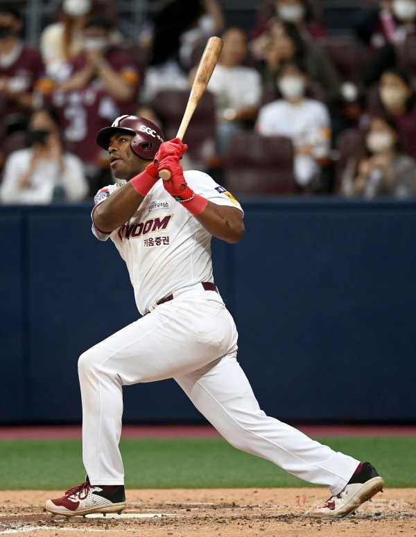 21일 서울 고척스카이돔에서 ‘2022 신한은행 MY CAR KBO리그’ 삼성 라이온즈와 키움 히어로즈 경기가 열렸다. 3회말 무사 키움 푸이그가 좌월 솔로 홈런을 날리고 있다.