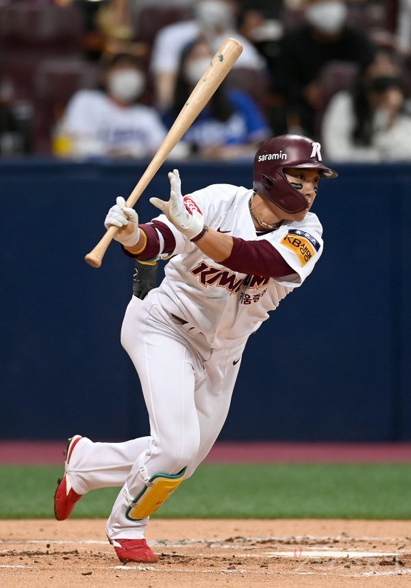 21일 서울 고척스카이돔에서 ‘2022 신한은행 MY CAR KBO리그’ 삼성 라이온즈와 키움 히어로즈 경기가 열렸다. 1회말 2사 1루 키움 김태진이 우전 안타를 치고 있다.
