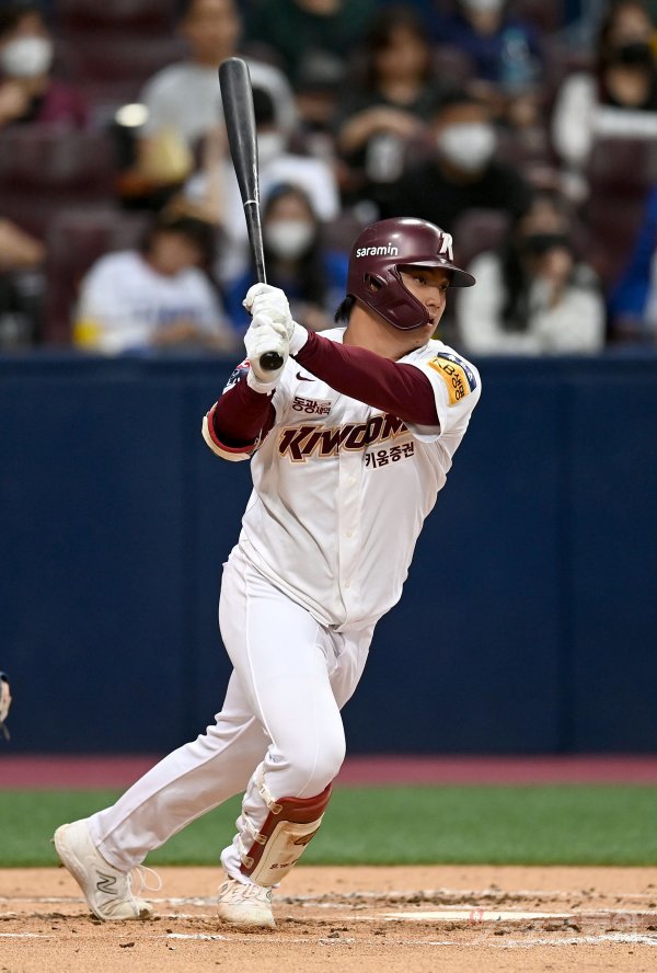 21일 서울 고척스카이돔에서 ‘2022 신한은행 MY CAR KBO리그’ 삼성 라이온즈와 키움 히어로즈 경기가 열렸다. 1회말 2사 1,2루 키움 이주형이 1타점 적시타를 치고 있다.