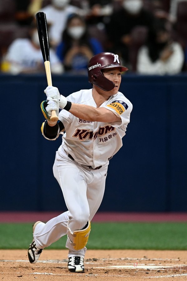 21일 서울 고척스카이돔에서 ‘2022 신한은행 MY CAR KBO리그’ 삼성 라이온즈와 키움 히어로즈 경기가 열렸다. 1회말 무사 키움 김준완이 우전 2루타를 치고 있다.