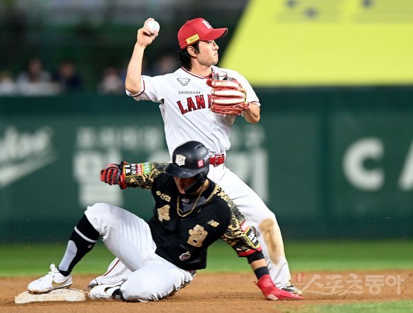 21일 인천 SSG 랜더스필드에서 ‘2022 신한은행 SOL KBO리그’ SSG 랜더스와 kt 위즈의 경기가 열렸다. 7회초 무사 1루에서 SSG 김성현이 kt 1루 주자 배정대를 2루에서 포스 아웃시킨 후 1루로 송구하고 있다.