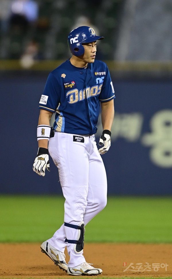 21일 서울 잠실야구장에서 열린 ‘2022 신한은행 SOL KBO리그’ 두산 베어스와 NC 다이노스의 경기에서 6회초 2사 만루 NC 이명기가 2타점 우전 2루타를 친 후 심판에게 타임을 요청하고 있다.