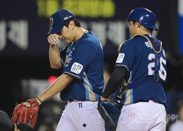 21일 서울 잠실야구장에서 열린 ‘2022 신한은행 SOL KBO리그’ 두산 베어스와 NC 다이노스의 경기에서 5회말 1사 1, 2루 두산에 실점한 NC 송명기가 아쉬워하고 있다.