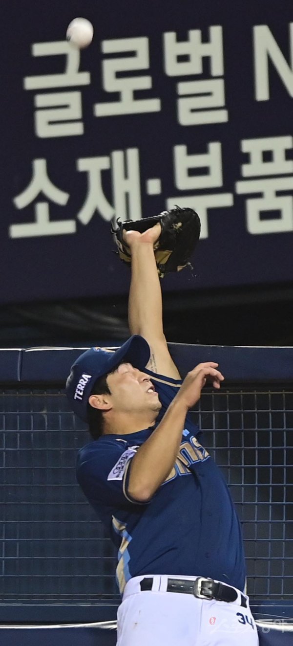 21일 서울 잠실야구장에서 열린 ‘2022 신한은행 SOL KBO리그’ 두산 베어스와 NC 다이노스의 경기에서 5회말 1사 1, 2루 두산의 뜬공을 NC 1루수 오영수가 놓치고 있다.