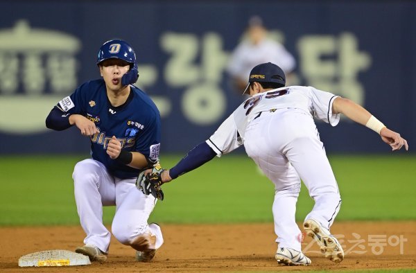 21일 서울 잠실야구장에서 열린 ‘2022 신한은행 SOL KBO리그’ 두산 베어스와 NC 다이노스의 경기에서 7회초 1사 1루 상황에서 NC 1루주자 박건우가 2루로 도루를 성공하고 있다.