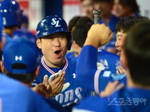 21일 서울 고척스카이돔에서 ‘2022 신한은행 MY CAR KBO리그’ 삼성 라이온즈와 키움 히어로즈 경기가 열렸다. 7회초 2사 1루 삼성 이원석이 좌월 투런 홈런을 날리고 그라운드를 돌아 홈인해 하이파이브 하고 있다.