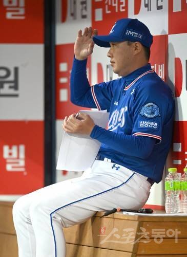 21일 서울 고척스카이돔에서 ‘2022 신한은행 MY CAR KBO리그’ 삼성 라이온즈와 키움 히어로즈 경기가 열렸다. 삼성 박진만 감독대행이 경기를 바라보고 있다.