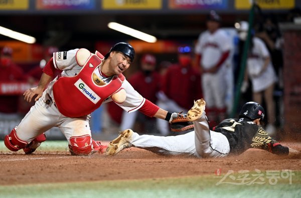 21일 인천 SSG 랜더스필드에서 ‘2022 신한은행 SOL KBO리그’ SSG 랜더스와 kt 위즈의 경기가 열렸다. 9회초 무사 1, 2루에서 내야땅볼 때 kt 2루 주자 심우준이 상대 실책을 틈타 SSG 이재원의 태그를 피해 득점을 올리고 있다.