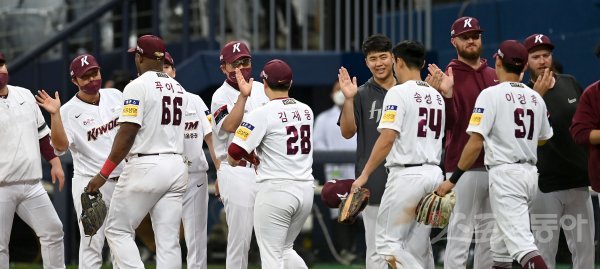 21일 서울 고척스카이돔에서 ‘2022 신한은행 MY CAR KBO리그’ 삼성 라이온즈와 키움 히어로즈 경기가 열렸다. 5-4 승리를 거둔 후 키움 홍원기 감독이 선수들과 하이파이브 하고 있다.