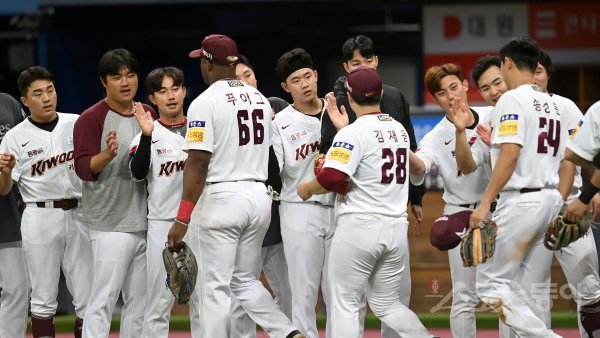 21일 서울 고척스카이돔에서 ‘2022 신한은행 MY CAR KBO리그’ 삼성 라이온즈와 키움 히어로즈 경기가 열렸다. 5-4 승리를 거둔 후 키움 선수들이 하이파이브 하고 있다.