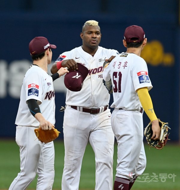 21일 서울 고척스카이돔에서 ‘2022 신한은행 MY CAR KBO리그’ 삼성 라이온즈와 키움 히어로즈 경기가 열렸다. 5-4 승리를 거둔 후 키움 푸이그가 하이파이브 하고 있다.