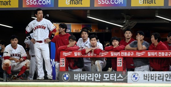 21일 인천 SSG 랜더스필드에서 ‘2022 신한은행 SOL KBO리그’ SSG 랜더스와 kt 위즈의 경기가 열렸다. 3-4로 뒤진 9회말 SSG 마지막 공격 때 선수들이 더그아웃에서 경기를 지켜보고 있다.