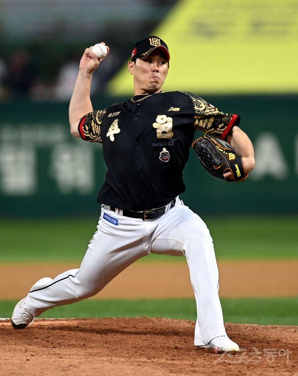 21일 인천 SSG 랜더스필드에서 ‘2022 신한은행 SOL KBO리그’ SSG 랜더스와 kt 위즈의 경기가 열렸다. 9회말 무사에서 kt 마무리 김재윤이 구원 등판해 볼을 던지고 있다.