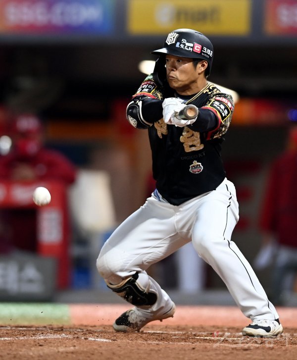 21일 인천 SSG 랜더스필드에서 ‘2022 신한은행 SOL KBO리그’ SSG 랜더스와 kt 위즈의 경기가 열렸다. 9회초 무사 1, 3루에서 kt 조용호가 스퀴즈 번트를 성공시키고 있다.