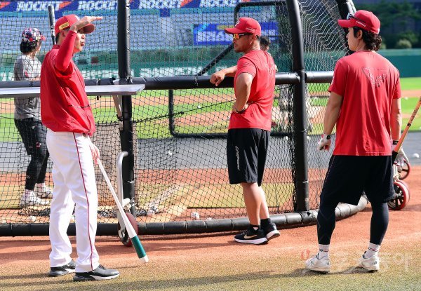22일 인천 SSG 랜더스필드에서 ‘2022 신한은행 SOL KBO리그’ SSG 랜더스와 한화 이글스의 경기가 열린다. 경기 전 SSG 김원형 감독이 김성현에게 타격에 대해 조언하고 있다.
