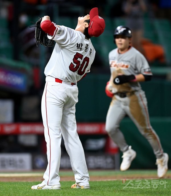 22일 인천 SSG 랜더스필드에서 ‘2022 신한은행 SOL KBO리그’ SSG 랜더스와 한화 이글스의 경기가 열렸다. 3회초 1사 3루에서 동점을 허용한 SSG 선발투수 박종훈이 아쉬워하고 있다.