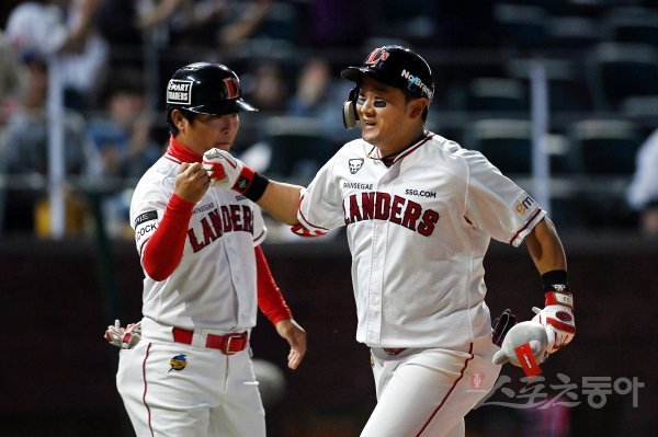 22일 인천 SSG 랜더스필드에서 ‘2022 신한은행 SOL KBO리그’ SSG 랜더스와 한화 이글스의 경기가 열렸다. 2회말 무사에서 SSG 최주환이 솔로 홈런을 쏘아 올린 후 코치의 환영을 받고 있다.
