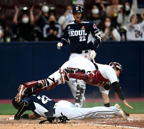 22일 서울 고척스카이돔에서 ‘2022 신한은행 MY CAR KBO리그’ 두산 베어스와 키움 히어로즈 경기가 열렸다. 4회초 무사 1,3루 상황에서 두산 1루주자 2루 도루하는 사이 3루주자 강승호가 홈으로 달려 세이프 되고 있다.