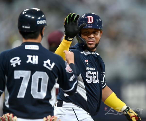 22일 서울 고척스카이돔에서 ‘2022 신한은행 MY CAR KBO리그’ 두산 베어스와 키움 히어로즈 경기가 열렸다. 4회초 무사 만루 두산 페르난데스가 동점을 만드는 2타점 우전 안타를 치고 1루에서 기뻐하고 있다.