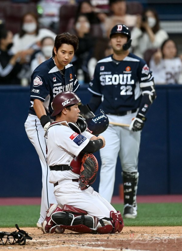22일 서울 고척스카이돔에서 ‘2022 신한은행 MY CAR KBO리그’ 두산 베어스와 키움 히어로즈 경기가 열렸다. 4회초 무사 1,3루 상황에서 두산 1루주자 2루 도루하는 사이 3루주자 강승호가 홈으로 달려 세이프 됐다. 이 과정에서 키움 김재현과 충돌한 강승호가 사과를 하고 있다.