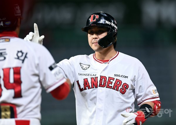 22일 인천 SSG 랜더스필드에서 ‘2022 신한은행 SOL KBO리그’ SSG 랜더스와 한화 이글스의 경기가 열렸다. 8회말 2사 2루에서 SSG 최정이 1타점 적시타를 날린 후 환호하고 있다.
