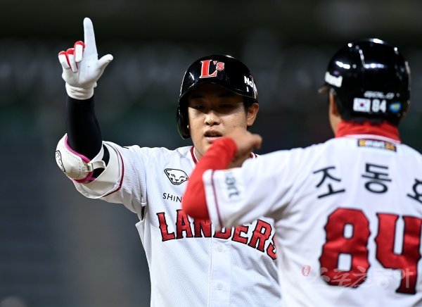 22일 인천 SSG 랜더스필드에서 ‘2022 신한은행 SOL KBO리그’ SSG 랜더스와 한화 이글스의 경기가 열렸다. 8회말 2사 1, 2루에서 SSG 대타 이정범이 1타점 적시타를 날린 후 환호하고 있다.