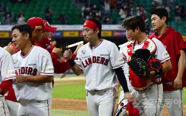 22일 인천 SSG 랜더스필드에서 ‘2022 신한은행 SOL KBO리그’ SSG 랜더스와 한화 이글스의 경기가 열렸다. SSG가 한화를 상대로 10-1로 승리한 후 결승 스퀴즈 번트를 성공시킨 최지훈이 김원형 감독의 환영을 받고 있다.