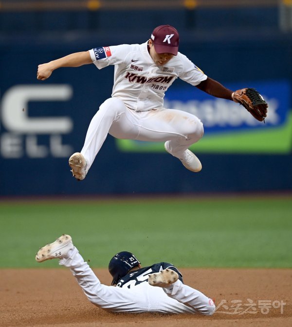 22일 서울 고척스카이돔에서 ‘2022 신한은행 MY CAR KBO리그’ 두산 베어스와 키움 히어로즈 경기가 열렸다. 9회초 무사 1루 상황에서 두산 이유찬이 2루 도루에 성공하고 있다.