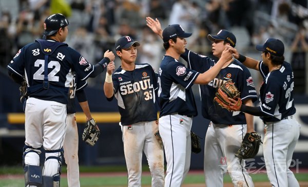 22일 서울 고척스카이돔에서 ‘2022 신한은행 MY CAR KBO리그’ 두산 베어스와 키움 히어로즈 경기가 열렸다. 5-2 승리를 거둔 두산 선수들이 하이파이브 하고 있다.