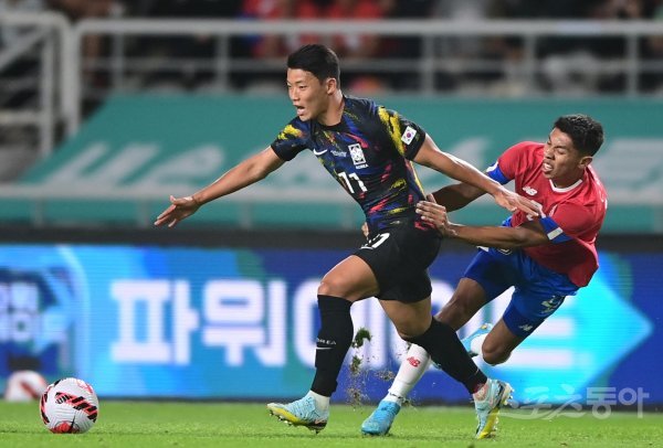 23일 경기도 고양종합운동장에서 열린 ‘하나은행 초청 축구국가대표팀 친선경기’ 한국과 코스타리카의 경기에서 한국 황희찬이 코스타리카 수비수를 뚫고 드리블 돌파하고 있다.