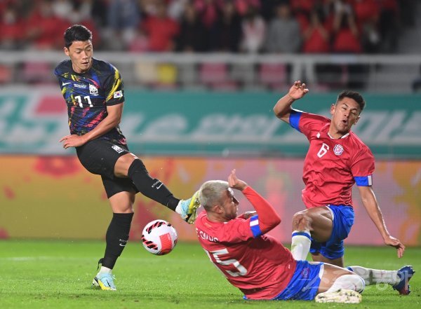 23일 경기도 고양종합운동장에서 열린 ‘하나은행 초청 축구국가대표팀 친선경기’ 한국과 코스타리카의 경기에서 한국 황희찬이 코스타리카 수비수 앞에서 슈팅을 하고 있다.