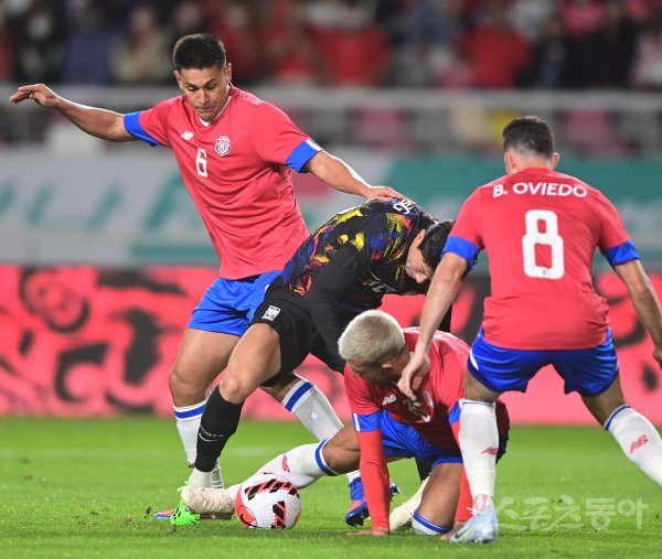 23일 경기도 고양종합운동장에서 열린 ‘하나은행 초청 축구국가대표팀 친선경기’ 한국과 코스타리카의 경기에서 한국 황의조가 코스타리카 수비 사이에서 드리블을 하고 있다.