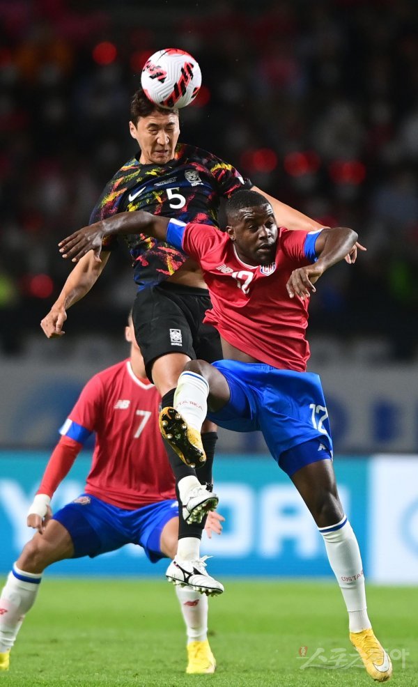 23일 경기도 고양종합운동장에서 열린 ‘하나은행 초청 축구국가대표팀 친선경기’ 한국과 코스타리카의 경기에서 한국 정우영이 코스타리카 공격수 뒤에서 헤딩을 하고 있다.