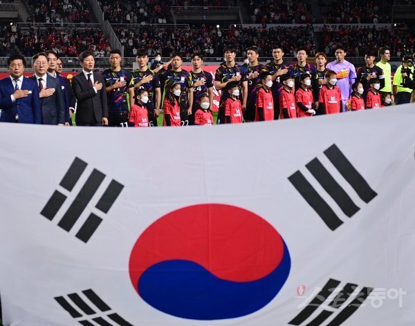 23일 경기도 고양종합운동장에서 열린 ‘하나은행 초청 축구국가대표팀 친선경기’ 한국과 코스타리카의 경기에 앞서 한국 축구대표팀 선수들이 애국가를 제창하고 있다.
