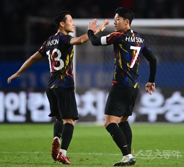 23일 경기도 고양종합운동장에서 열린 ‘하나은행 초청 축구국가대표팀 친선경기’ 한국과 코스타리카의 경기에서 한국 손흥민이 프리킥으로 동점골을 성공시킨 후 손준호와 기쁨을 나누고 있다.