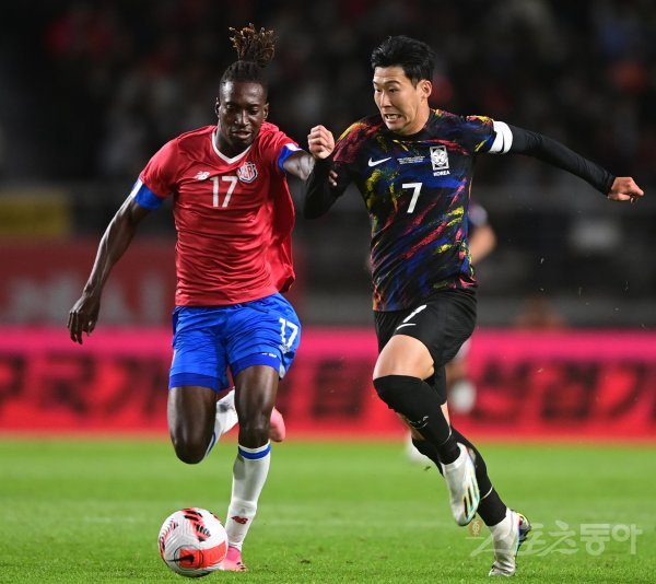 23일 경기도 고양종합운동장에서 열린 ‘하나은행 초청 축구국가대표팀 친선경기’ 한국과 코스타리카의 경기에서 한국 손흥민이 코스타리카 수비를 뚫고 드리블 돌파하고 있다.